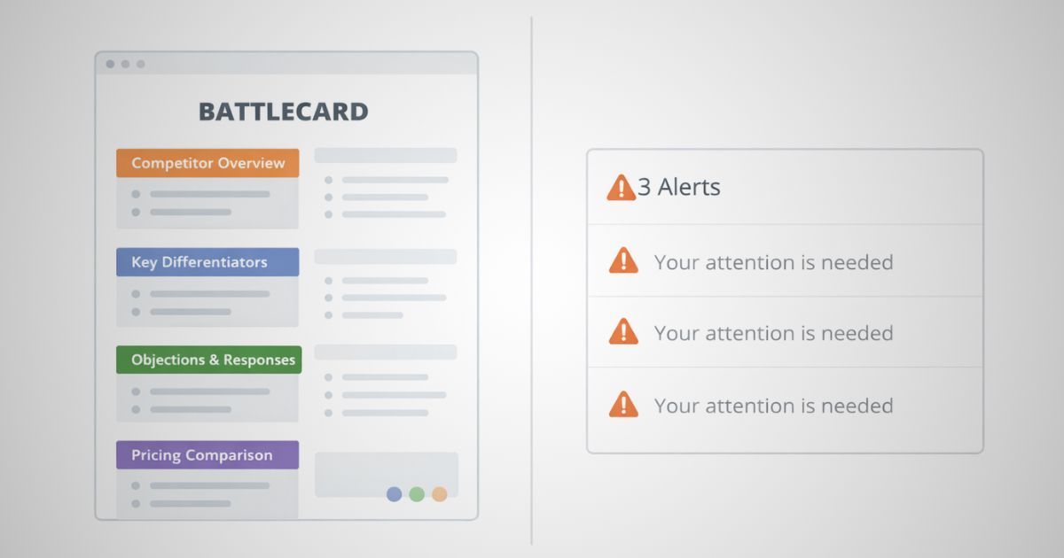 And battlecards are only as current as the competitive intelligence feeding them. If your monitoring is inconsistent — which is likely if it is being done manually — your battlecards go stale. You end up with a sales enablement tool built on outdated information.